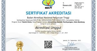 Berita menggembirakan datang dari Program Studi Sarjana Teknik Kimia Universitas Katolik Parahyangan. Sejak 14 September 2021, Prodi Sarjana TK UNPAR berhasil meraih status akreditasi “Unggul” berdasarkan hasil penilaian dari Badan Akreditasi Nasional Perguruan Tinggi (BAN-PT). Hal ini tertuang dalam Keputusan BAN-PT No. 10835/SK/BAN-PT/AK-ISK/S/IX/2021. Hasil akreditasi yang diperoleh ini cukup membanggakan. …